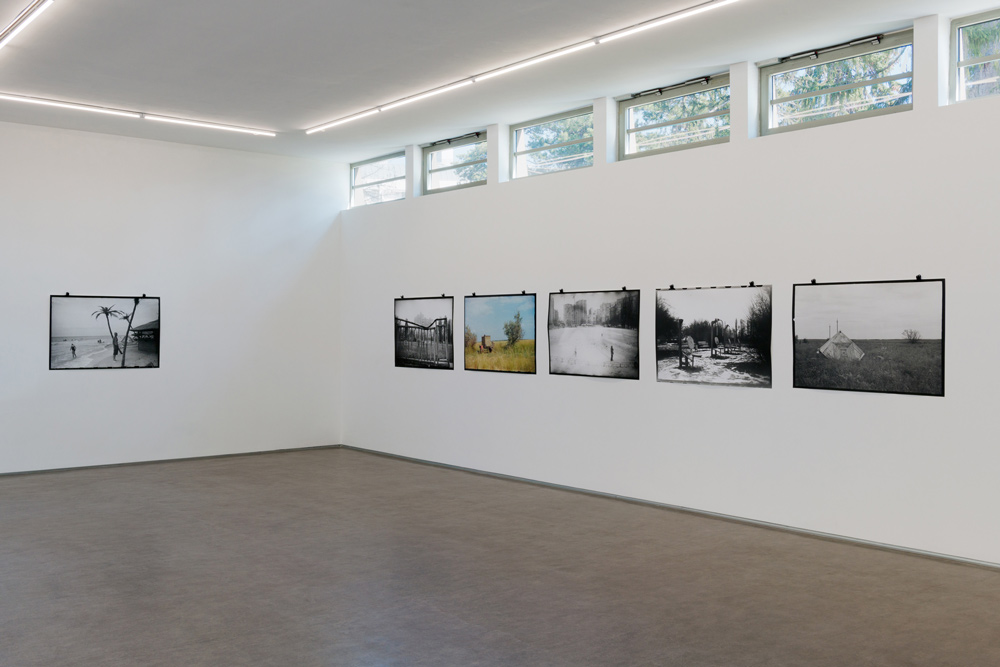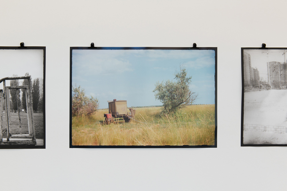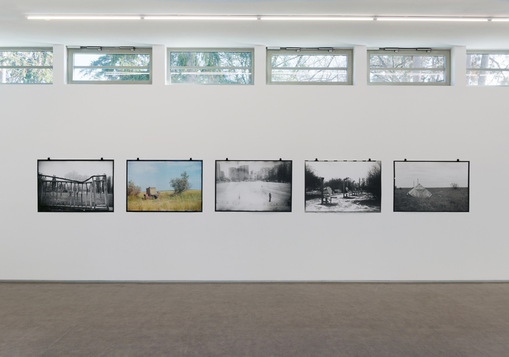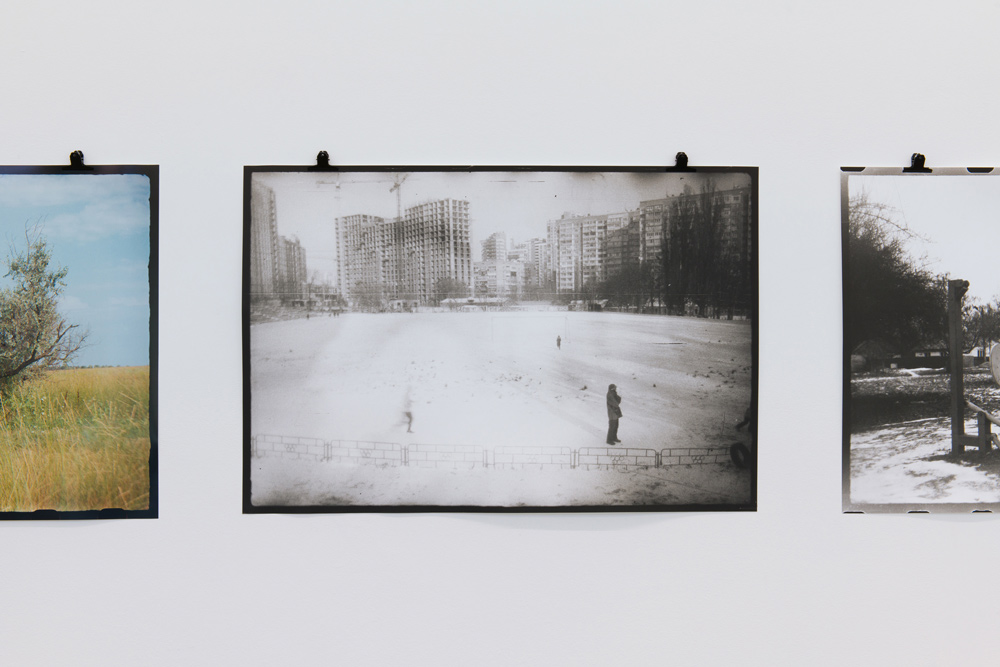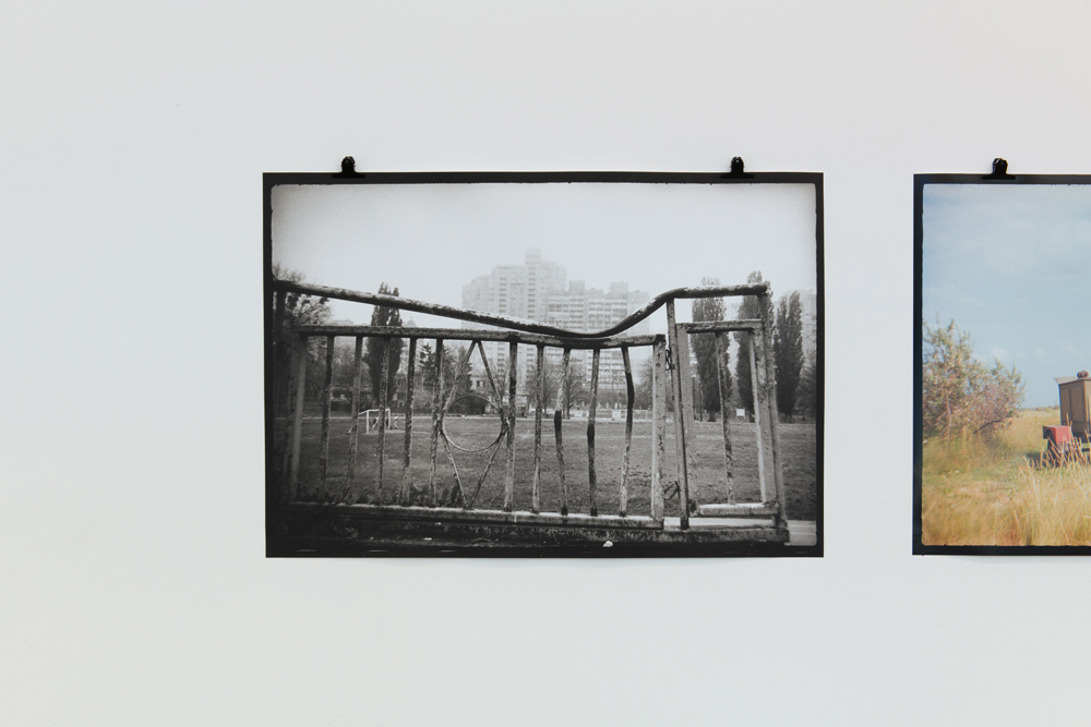 Out of Sight confronts viewers with a heterogeneous selection of six large-format photographs as well as a wall-spanning photograph comprising three vertical strips of images that Diachenko selected from a large volume of negatives she brought with her. The imagery presents different places and areas in Ukraine, which, apart from a few color images, were taken with old black and white film. Aberrations in color and exposure, as well as dust and scratches on the film or lens, are integral to her image aesthetic.