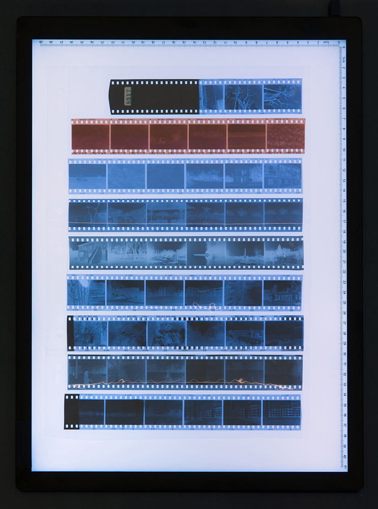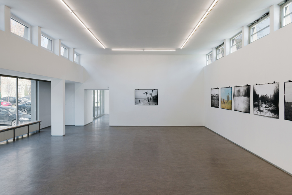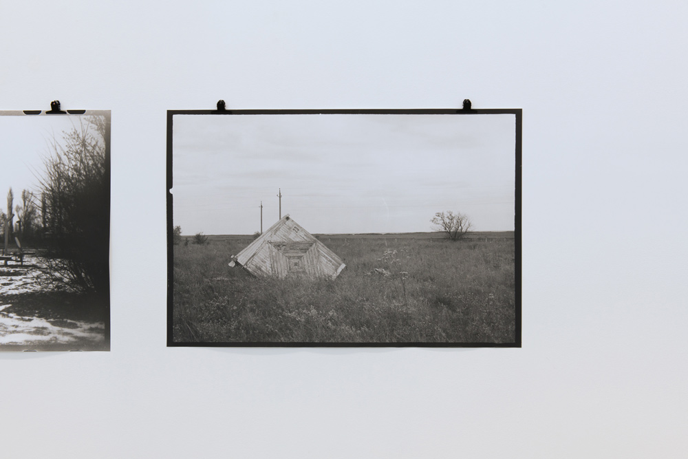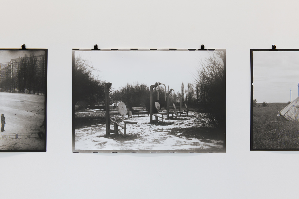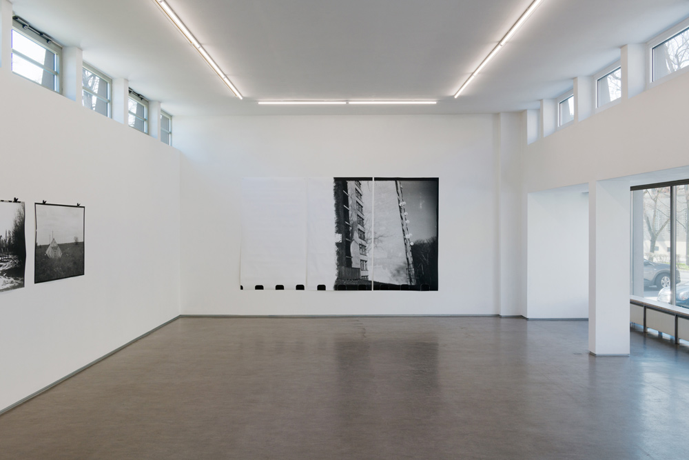 Out of Sight confronts viewers with a heterogeneous selection of six large-format photographs as well as a wall-spanning photograph comprising three vertical strips of images that Diachenko selected from a large volume of negatives she brought with her. The imagery presents different places and areas in Ukraine, which, apart from a few color images, were taken with old black and white film. Aberrations in color and exposure, as well as dust and scratches on the film or lens, are integral to her image aesthetic.
