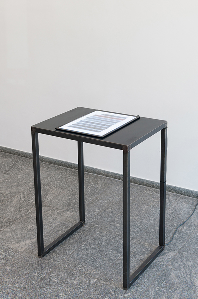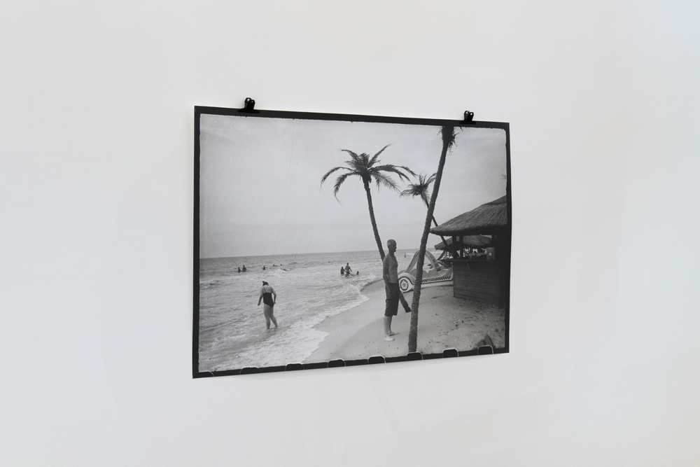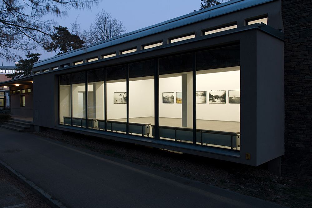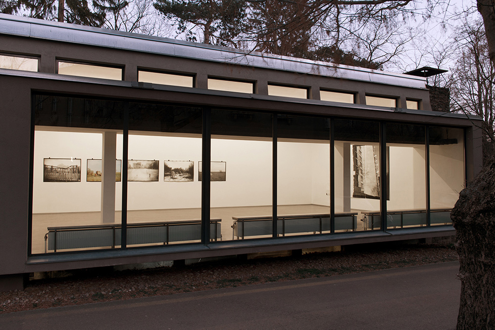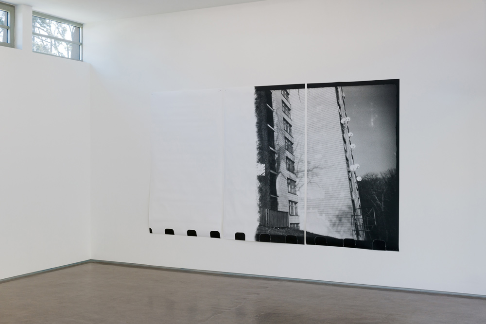 The wall-spanning, black-and-white photo consisting of three strips of images installed on the far wall of the exhibition space, confronts the viewer predominantly with a non-image, a loss of visibility. The artist has chosen the first negative at the beginning of the roll; the left third of the image is completely overexposed. The pictorial void functions as a metaphor for the loss of pictorial (archival) documentation or, more generally, for gaps in memory per se.