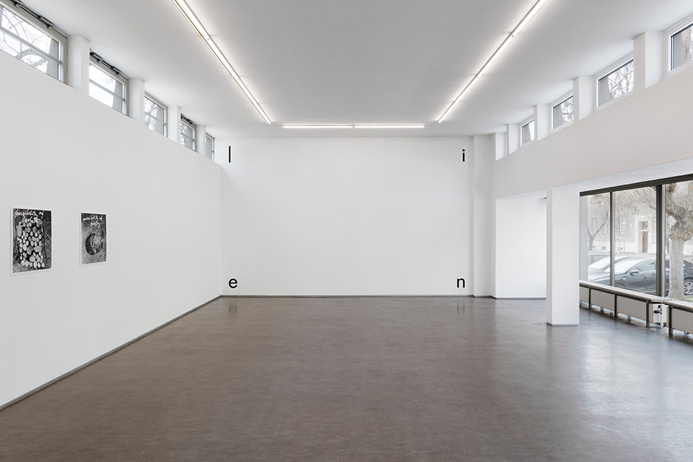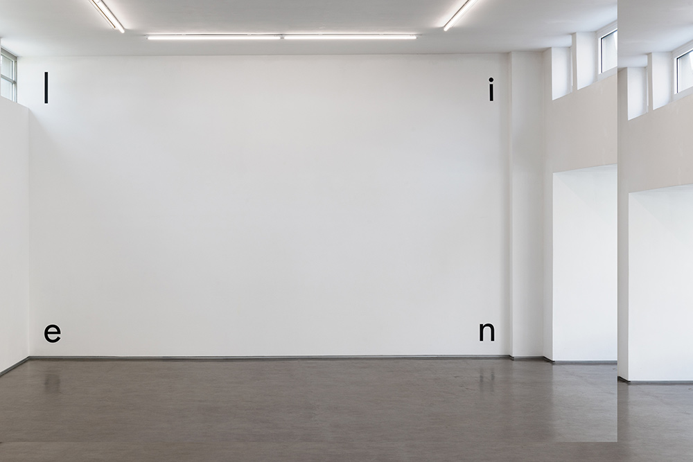 Line, based on a design created by the artist, the letters l, i, n, and e appear in the form of 50 cm tall adhesive versions affixed to the corners of the gallery’s far wall. Valoch reduces and dissects the word so radically in this text installation that it remains virtually atomized in empty space or pictorial space. The reduction does not produce a semantic emptiness, but rather represents a condensation of “other,” potential meanings. This draws attention to the language itself, as well as to its reception and recipients.