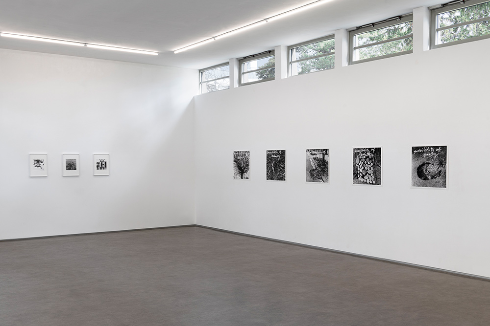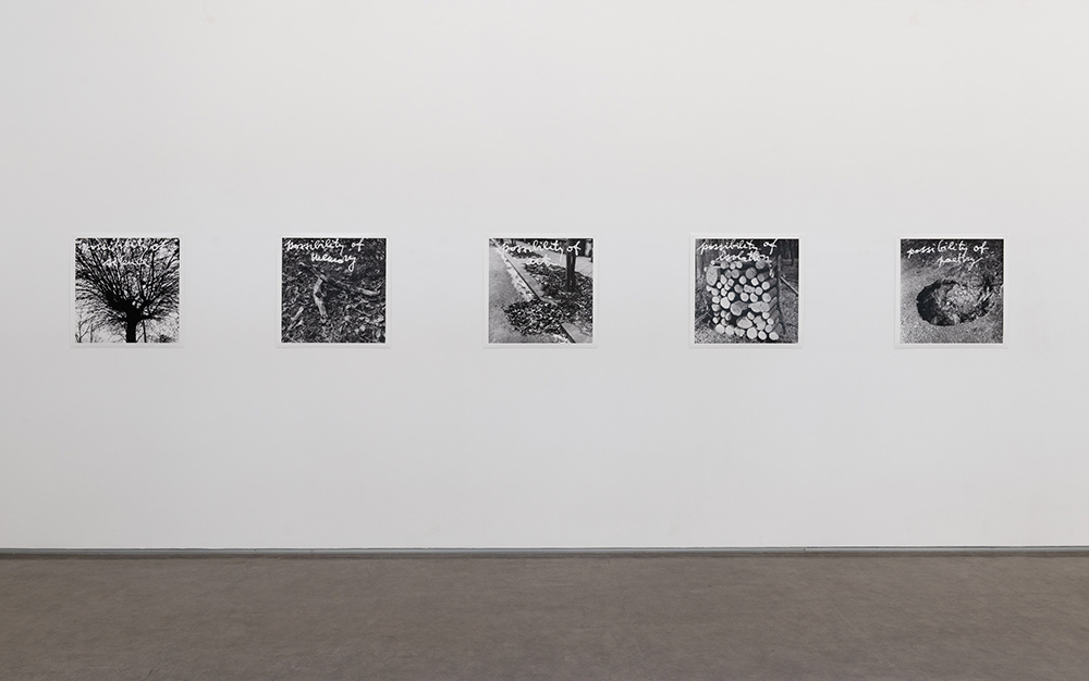 II, like virtually all of Valoch’s photographic series, are connected to the landscape of the Moravian Karst, the archeological site where his father worked. But beyond the documentary feel and effect of the images, Valoch intervenes in both series by marking the negatives by hand. After years of de-semanticization, a semantic use of language re-emerges, albeit in a simple, almost abstract way. Each motif is juxtaposed with a personal note or text fragment—once again, a modular-structural approach from earlier text works is evident—which immediately begins to label, semanticize, and transform what is shown. Legible on the images is the phrase: “Possibility of silence, art, dreaming, freedom, love, etc.” The photographs, in turn, depict a woodpile, forest floor, a hole in the ground, a treetop, and so forth. The effect of text on image turns the visual poems into a kind of poetic searching. In so doing, image and text condition an individual process of mutual activation and semanticization in the eye and mind of the viewer.