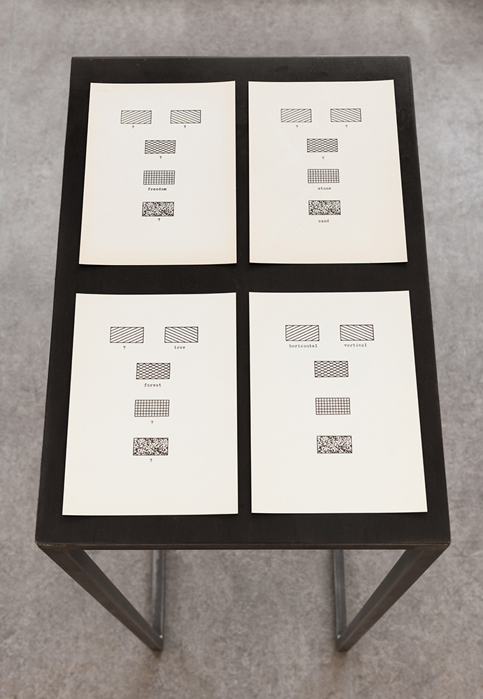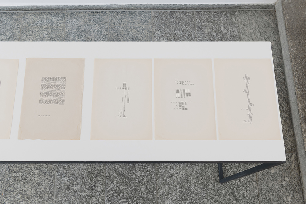 As a counterpart to the small-format typewriter works of the 1960s and ’70s, the exhibition also features a comparatively later, highly tautological text work with a pronounced spatial presence. In the text installation