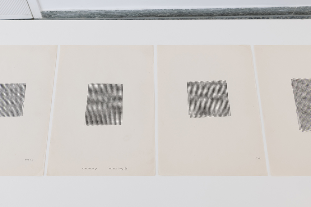 Optical Poems presented in PRE-PICTORIAL, dating from 1966 and 1968—already feature radically asemantic poems. These works are increasingly defined by their visual appearance—the optical presence and interplay of graphemic structures produced by a mechanical typewriter. Through the repetition, displacement, and superimposition of sequences of signs, structures and spatial arrangements emerge that arise primarily in the eye of the beholder and lie far beyond the usual meanings of the “misused” letters and typewriter characters. Discernible here is a strong emphasis on visual and rhythmic–acoustic qualities, coupled with conceptual thinking. Valoch no longer focuses on the characters and their intrinsic content, but instead subverts, undermines, reverses, and even negates this. The characters become graphic building blocks of an autonomous and abstract nature, of pure, concrete material.