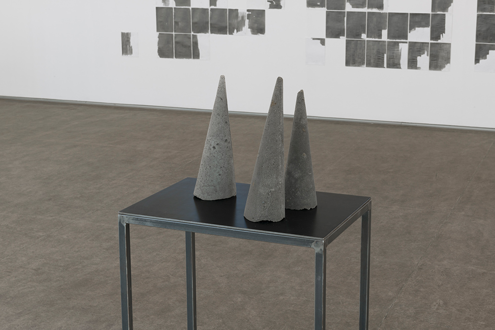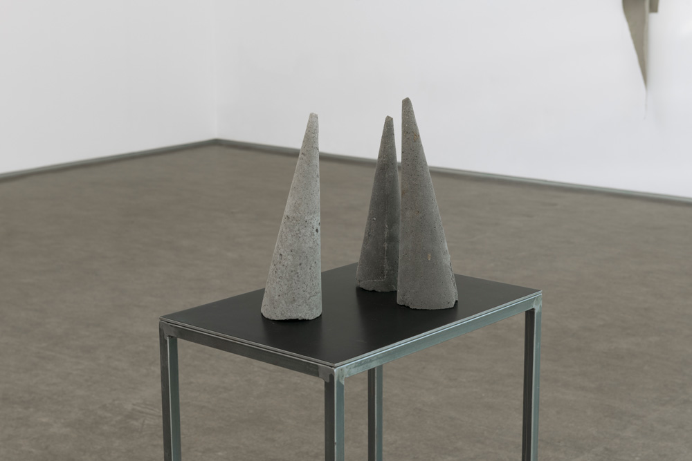 Ash Cones. Here Biggio confronts the viewer with small conical sculptures made of ash. On his family’s property in Calasetta, a remote spot on Sardinia, Biggio collected the fallen leaves from trees his father once planted. Then he burned the leaves and formed elaborate, conical sculptures from the ashes by hand. The success of the process was by no means certain, some sculptures could not be completed, others disintegrated immediately after production. Always implicit to the successful form is also its potential failure.
