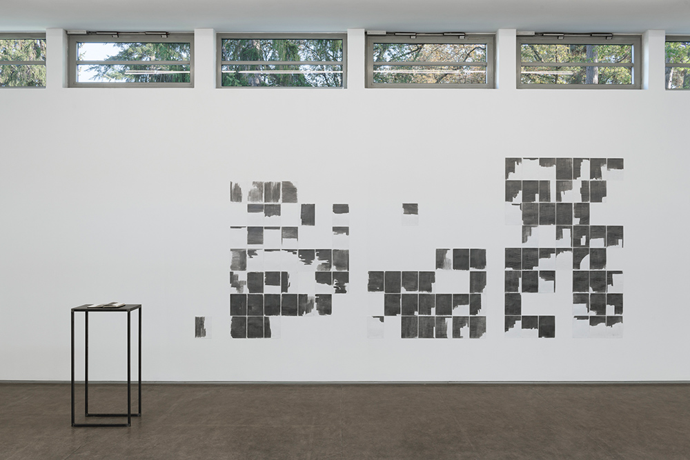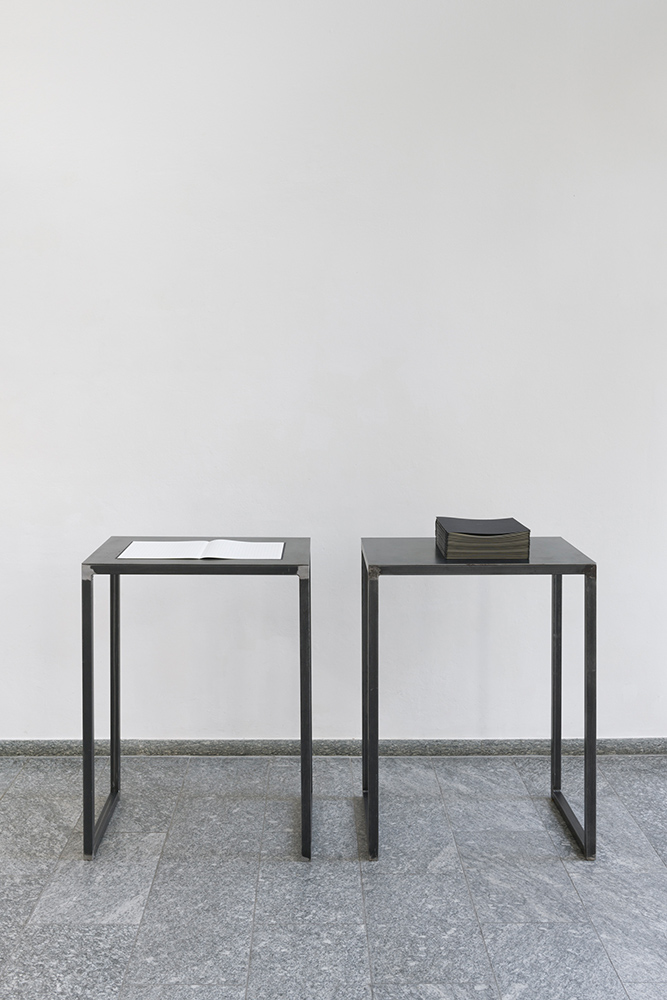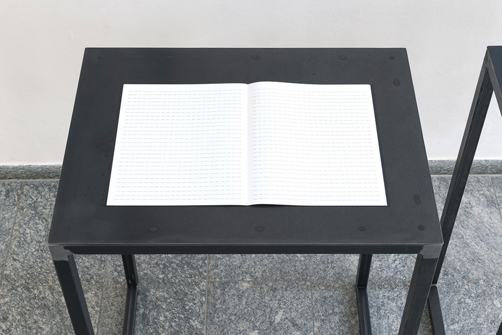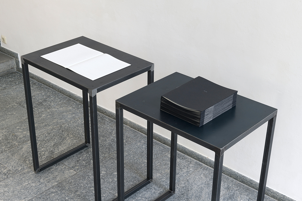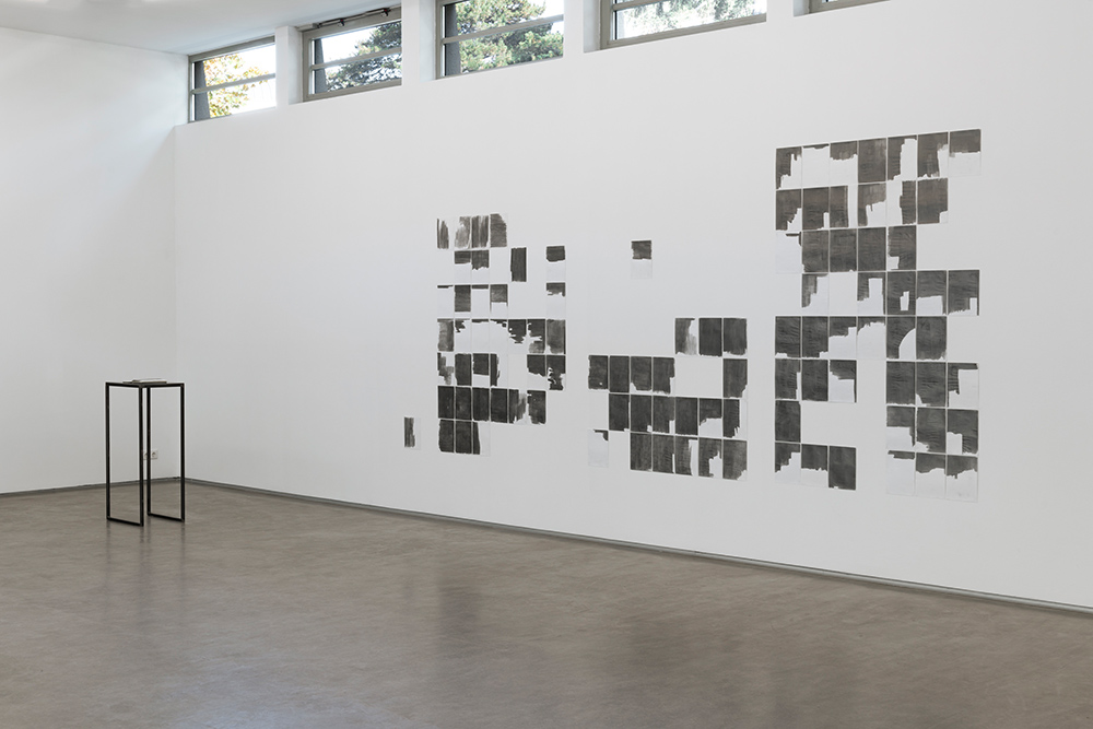 The transformational moment plays a central role in both Alessandro Biggio’s and Lucía Simón Medina’s working methods. In Medina’s works, this transformation does not occur, as with Biggio, in the shifting between one “aggregate state” and another, but between numbers and musical notation. Taking place here is a kind of transcription, a transcoding of the ostensibly rational and ordered into the aesthetically experienceable, the indistinct. But with both Medina and Biggio the perceptible shape, whether a libretto booklet or a shaped canvas, is ultimately not the actual object of perception and reflection. One’s own actions—writing down innumerable combinations of numbers or slowly layering and compacting ashes—opens up a temporal dimension that shifts the focus away from the initial aesthetic undertaking and towards the temporal process itself as a specific, visible form and focus of what’s exhibited. Both artists are skeptical of immediately perceptible form and question being rather than appearance, what’s hidden beyond the observable. Biggio and Medina are interested in fundamental, perhaps even universal aspects, and thus are also skeptical of their own intentions, of stated positions, formal manifestations, and related genius. Both artists seek to circumvent or eliminate direct intentionality in artistic activity. In their transcriptions and transformations, they open up a space no longer limited to the subjective but an explicitly sensory one to be experienced subjectively—an aesthetic space articulated with Medina in resonance with the systematic space of numbers and occurring with Biggio in the amimetic reworking of the material. In light of these elementary, indeed existential questions, the viewer is referred back to his own being, to the question of his own being beyond what is presented and represented.