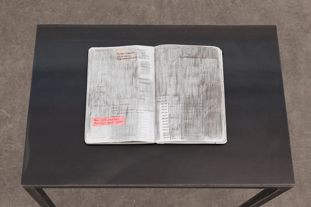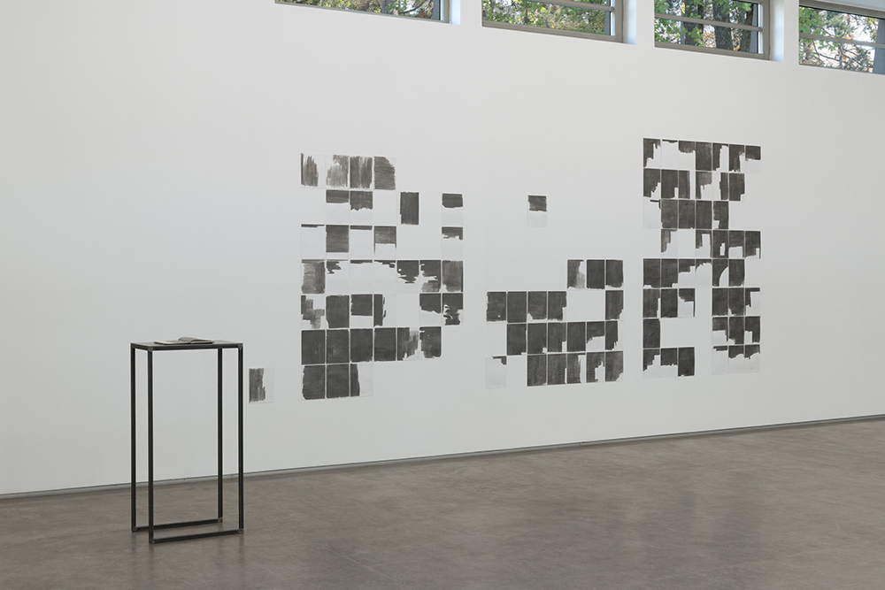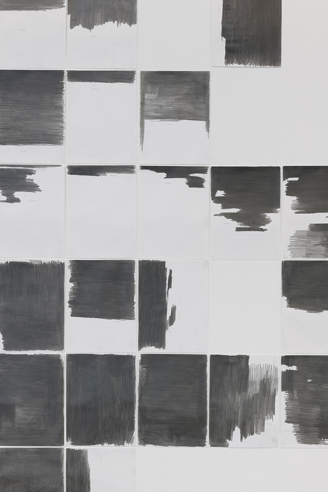 agenda, the initial aesthetic by-product was ultimately condensed into an independent series of sheets, some of which were completely covered with graphite. The described or rather referenced sheets not only form peripheral traces of the process, they are themselves legible as signatures of the temporal. The individual, graphite-covered calendar page goes from being a medium of representing time (of the day, of the week) to being a medium of temporization itself, a notation perpetuated repetitively in the rhythm of making notations.