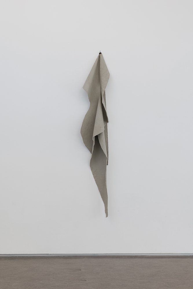 With Biggio, the link between image and subject matter is no longer a mimetic but a purely indexical one, articulated through his use of the materials of transformed ash and clay. Oscillating between draped fabrics and shaped canvases, his meta-portraits do not depict but represent autonomous structures that gently rise out of two-dimensionality, reaching outward into the spatial and sculptural. The material qualities of the semi-pictorial forms, that is the folds and curves of the cotton fabric, give them a kind of movement and dynamism, while the potential brittleness of the clay visually also reveals its vulnerable side, which gives the meta-portraits something essential and fragile.