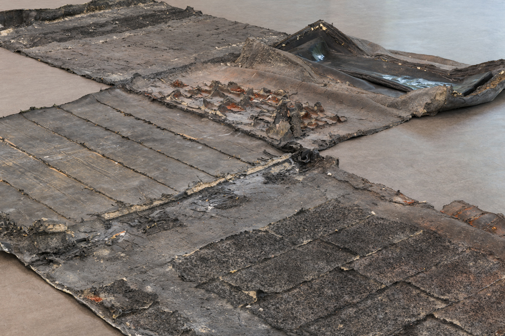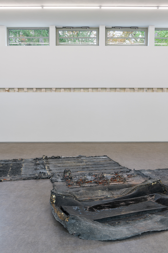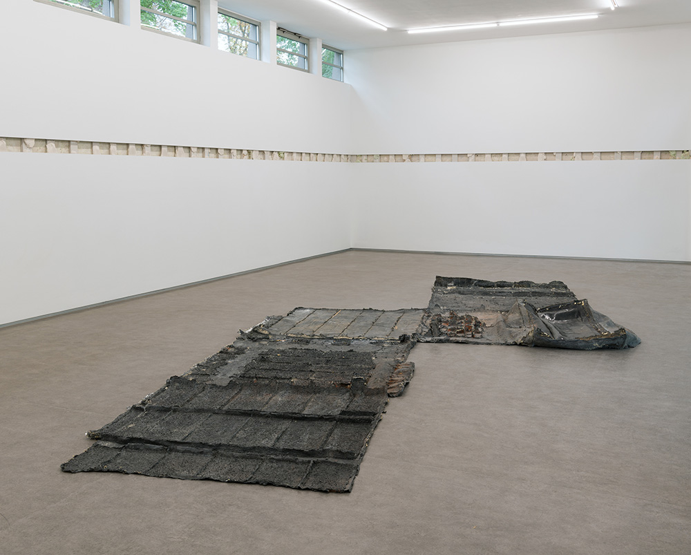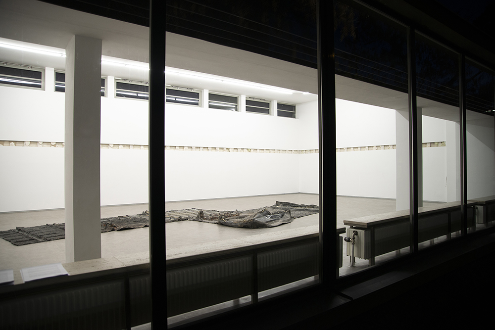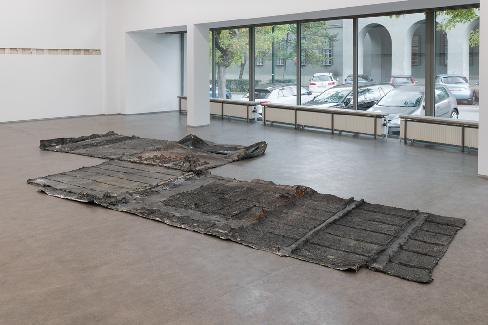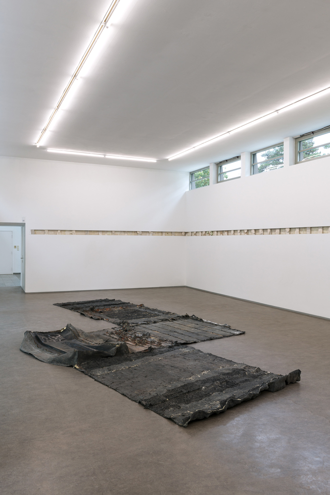 The focus of Erik Smith’s second spatial intervention is a small, previously hidden space—located above the entrance to the main gallery—that for unknown reasons was originally bricked up and thus remained inaccessible for decades. The roughly two-cubic-meter “room,” which was “found” and opened up several years ago during renovation work, features, in the manner of a small domain, not only a window but also its own floor boards. Over weeks of process-intensive work, Smith created an “indexical” cast of the walls and floors of the hidden cube out of a composite of latex and multiple layers of canvas. The latex was applied to and then peeled off the walls, translating all surface phenomena into a flat, negative form. Discernable are brick textures, wood grains from the floor, as well as a high-gloss surface indicating the position of the window. After removing the interjoined wall casts, Smith laid out the blackish, apocalyptic-looking form flat onto the floor of the gallery space. The formerly bricked-up (two-cubic-meter) cube confronts the viewer as an almost ethereal entity, which is only remotely reminiscent of the self-contained, cubic space.