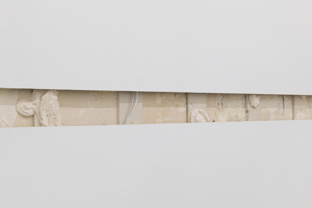 In the first of three sculptural, spatial interventions, Smith makes a horizontal cut across the entire interior wall of the exhibition space, exposing the “real” wall underneath. Decades ago, to create a more evenly surfaced wall, the interior was covered with a double-layered sheetrock wall, presenting the viewer with a perfect wall, in effect the image of a wall. The gap—a five-centimeter-deep crevice between the sheetrock and the wall of the building—thus becomes a kind of silent witness to the staging of art. The outward appearance of the perfect wall, the perfect space, is deprived here of its credibility in a latent, unexpressed way, it becomes legible as a constructed thing, as part of a specific regime of the gaze, and a certain ideal of art perception.