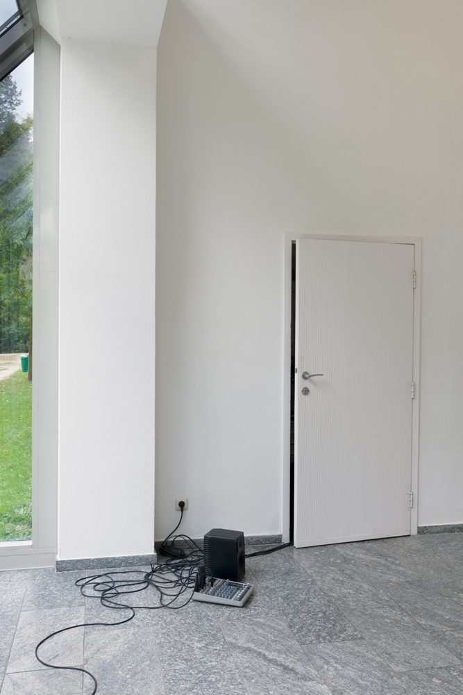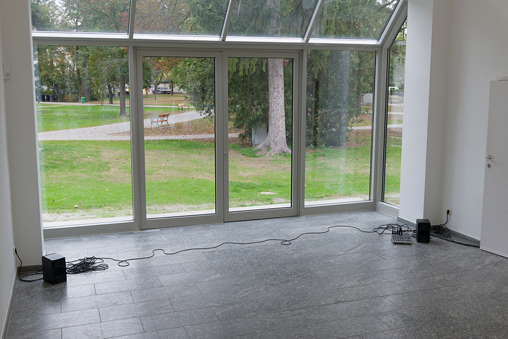 In the third work, a real-time audio transmission presented in the gallery building’s pavilion-like foyer, Erik Smith makes the basement of the building audible by means of piezo contact microphones affixed to its pipes and walls. The sound literally emerges from underground. Here, what’s unseen is made accessible and perceptible, similar to the wall cut in the main space, but is also translated medially. The basement of the institution is “revealed” to the viewer as a continuum of metallic, pipe-like sounds, intermittently interrupted by crackling, knocking, or short whistling noises. Here, too, in terms of the audible, Smith is concerned with the peripheral and indeterminate, in the moment of transition from information to disinformation, from sound to noise. The rather sonorous, drone-like reverberations oscillate between sound and noise. Its seemingly voice-like impression bestows the building not only with an imaginary register, but an animistic one, so that space here, akin to a being, even acquires a voice.